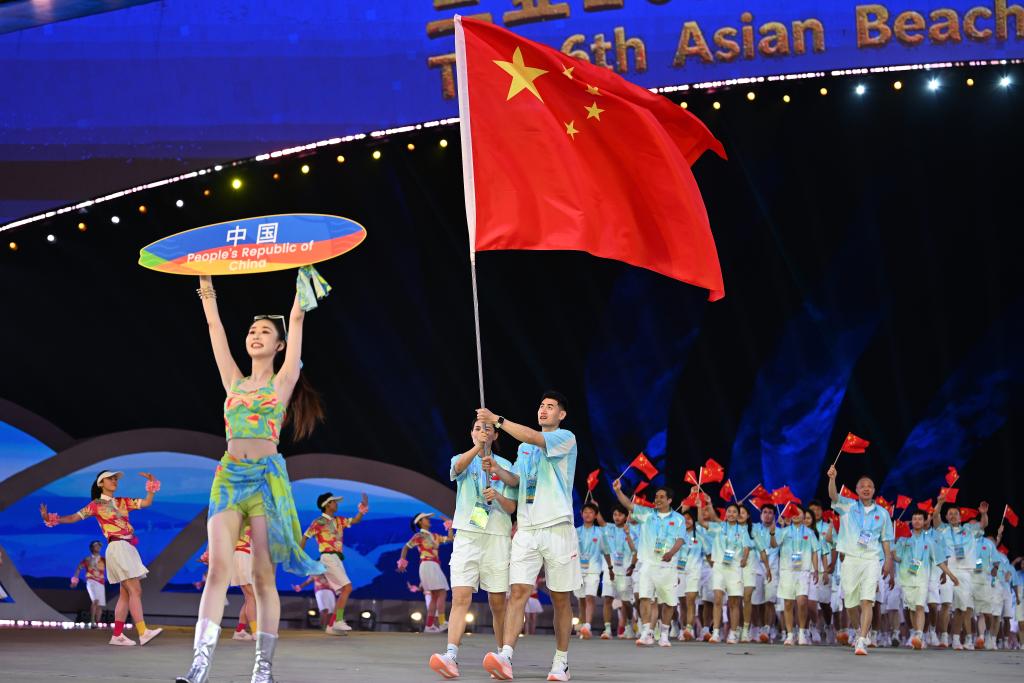 耀眼“中國紅”來了!沙灘手球運(yùn)動(dòng)員沈萍和三人籃球運(yùn)動(dòng)員顏鵬帶領(lǐng)中國體育代表團(tuán)入場(chǎng)。此次中國代表團(tuán)共派出255人,包括171名運(yùn)動(dòng)員,將參加除沙灘卡巴迪外13個(gè)大項(xiàng)、60個(gè)小項(xiàng)的比賽,是我國參加亞沙會(huì)以來參賽率最高的一屆。