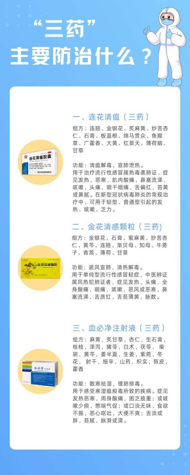 “三方”中的清肺排毒湯是源自于《傷寒論》的5個經(jīng)典方劑融合組成的,是國家診療方案中推薦的通用方劑?;瘽駭《痉胶托螖《痉绞窃谖錆h前線的臨床救治過程中,根據(jù)臨床觀察總結(jié)出來的有效方劑,也已獲批上市。準(zhǔn)確地說,目前“三方三藥”已成為了“六藥”。