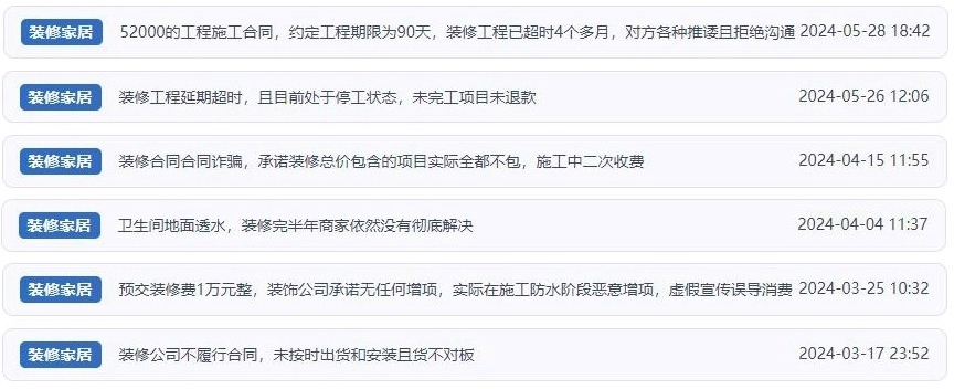 其實,有著同樣遭遇的消費者不在少數(shù)。公開報道顯示,今年以來有多個家裝機構(gòu)分公司或經(jīng)銷商跑路,還有個別不良裝修公司在短時間內(nèi)聚收大量預(yù)付款后攜款跑路,給消費者帶來經(jīng)濟財產(chǎn)損失?!叭嗣裢对V”梳理發(fā)現(xiàn),除閉店跑路外,目前平臺上涉及家裝消費類的投訴問題多聚焦于——