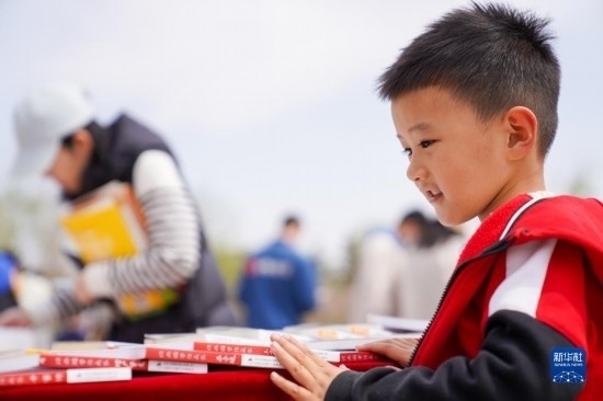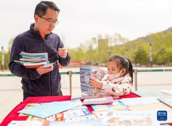 4月22日,一名小朋友在吉林省圖書(shū)館前的“換書(shū)大集”挑選圖書(shū)。