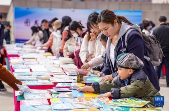 4月22日,市民在吉林省圖書(shū)館前的“換書(shū)大集”挑選圖書(shū)。