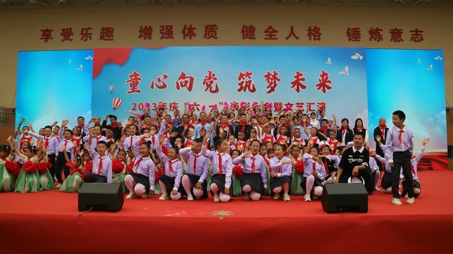 “少年時代是美好人生的前奏,是生命樂章的序曲,遠大抱負從這時萌生,高尚情操從這時孕育,良好品行從這時養(yǎng)成,過硬本領(lǐng)也從這時練就。希望所有同學(xué)要懂得感恩自己的父母,要聆聽老師的教導(dǎo),要遵守學(xué)校的規(guī)章制度,時刻嚴格要求自己,做一個理想遠大、品行端莊、學(xué)習(xí)優(yōu)良、身心健康的好學(xué)生,努力成為建設(shè)偉大祖國、建設(shè)美麗家鄉(xiāng)的有用之才、棟梁之材?!焙艉秃铺厥械谒闹袑W(xué)分校副校長陳平淵深情地向孩子們致以節(jié)日的問候和祝福,希望同學(xué)們度過一個健康、快樂、難忘的六一兒童節(jié)。