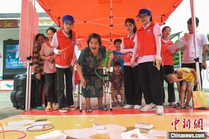 圖為學(xué)子們與村民共同體驗套圈讀順口溜游戲。 陳一鳴 攝