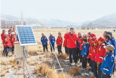 中科院珠峰站,工作人員給孩子們講解科學(xué)儀器的功能作用。新華社記者 孫 非攝