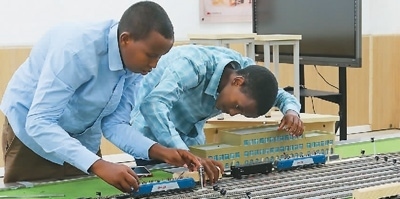 在位于吉布提首都吉布提市的吉布提工商學(xué)校,學(xué)生在魯班工坊鐵道運(yùn)營(yíng)沙盤教學(xué)區(qū)學(xué)習(xí)。 新華社發(fā) |