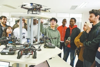 江蘇大學(xué)第四屆計算機(jī)文化節(jié)上,外國留學(xué)生在了解無人機(jī)功能和運(yùn)行原理。石玉成攝(影像中國)