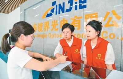 圖為近日,蒙山鎮(zhèn)黨員志愿者來到鏡界光電有限公司宣傳人才政策,指導企業(yè)申報相關(guān)人才項目。