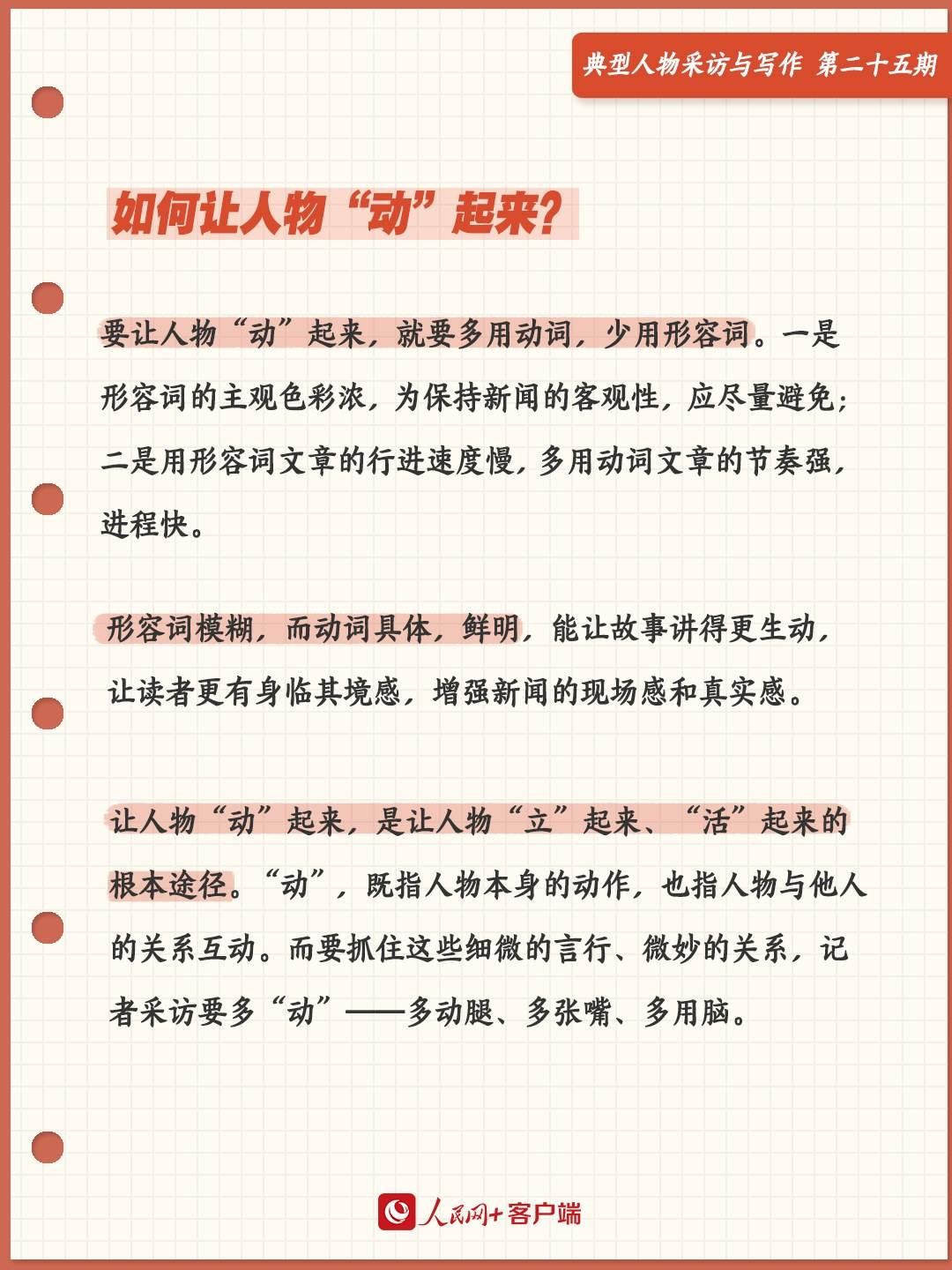 要讓人物“動”起來,就要多用動詞,少用形容詞。為什么?一是形容詞的主觀色彩濃,為了保持新聞的客觀性,應(yīng)盡量避免;二是用形容詞文章的行進(jìn)速度慢,多用動詞文章的節(jié)奏強(qiáng),進(jìn)程快。形容詞模糊,而動詞具體,鮮明,能讓故事講得更生動,讓讀者更有身臨其境感,增強(qiáng)新聞的現(xiàn)場感和真實感。