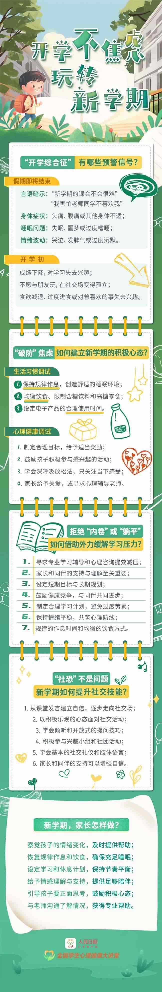 進(jìn)入開學(xué)倒計(jì)時(shí),孩子出現(xiàn)情緒低落、身體不適,還常把“不想上學(xué)”掛在嘴邊……這些都是“開學(xué)綜合征”的預(yù)警信號(hào)。面對新學(xué)期的挑戰(zhàn),孩子如何調(diào)整心態(tài)?家長如何應(yīng)對?心理健康專家來支招,帶你玩轉(zhuǎn)新學(xué)期。