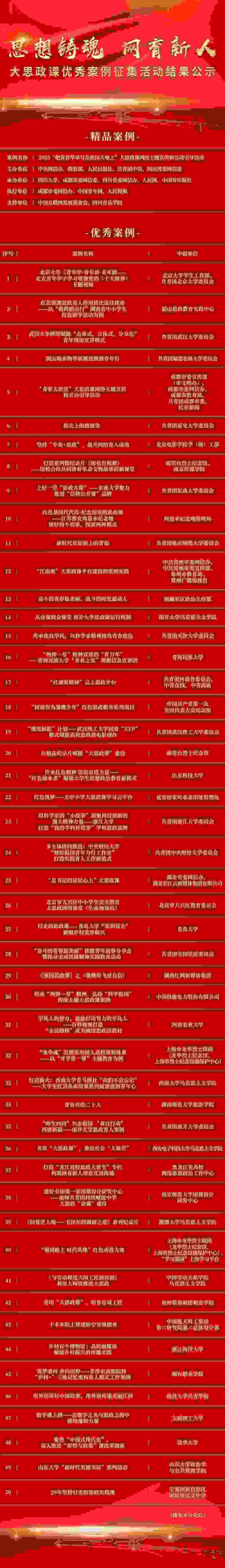 由中央網(wǎng)信辦網(wǎng)絡(luò)傳播局、共青團(tuán)中央宣傳部指導(dǎo),人民網(wǎng)、中國(guó)青年報(bào)社共同主辦的“思想鑄魂 網(wǎng)育新人”大思政課優(yōu)秀案例征集活動(dòng)評(píng)選結(jié)果已經(jīng)產(chǎn)生,現(xiàn)對(duì)擬入選案例進(jìn)行公示,公示時(shí)間為1月20日至1月24日,公示期間歡迎社會(huì)各界監(jiān)督評(píng)議,有關(guān)意見(jiàn)可發(fā)送至郵箱eduyouth@163.com,我們將及時(shí)受理、認(rèn)真核查,公示期滿后將適時(shí)對(duì)外發(fā)布最終結(jié)果。
