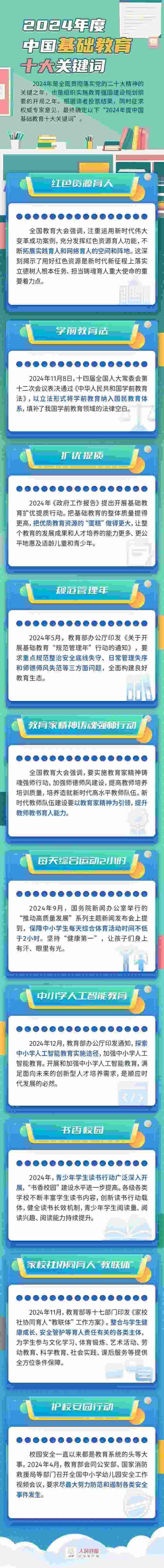 教育興則國家興,教育強則國家強。建設教育強國,基點在基礎教育。2024年是組織實施教育強國建設規(guī)劃綱要的開局之年。這一年來,中國基礎教育領域在深化綜合改革、加快推進高質(zhì)量發(fā)展的道路上奮勇向前,不斷增強人民群眾的教育獲得感、幸福感、安全感,繼續(xù)答好“強國建設、教育何為”的時代課題。在教育部基礎教育司指導下,人民日報少年客戶端推出《揭曉!2024年中國基礎教育十大關鍵詞》圖解,讓我們一起關注。