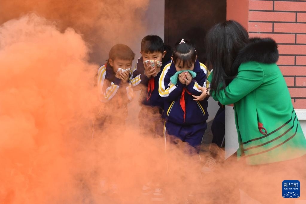 3月31日,在山東省青島市市北區(qū)杭州路小學(xué)開(kāi)展的校園消防安全主題教育活動(dòng)上,師生模擬校園安全門(mén)逃生演練。