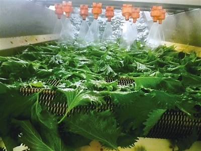 在紫蘇基地加工車間,20多名工人正在熱火朝天地忙碌著,采摘好的紫蘇葉在這里經(jīng)過清洗、精選、包裝等多道工序處理后,會(huì)按照不同品級(jí)進(jìn)行精細(xì)化捆扎分類,然后被送入冷庫進(jìn)行預(yù)冷,整個(gè)操作都是在無菌環(huán)境下進(jìn)行。“現(xiàn)在臨時(shí)工、長(zhǎng)期工加一起有20多人,5年來,我們?cè)谄咣倥_(tái)村、什不斜氣村、什拉烏素村等周邊培訓(xùn)了村民200人左右,他們每年農(nóng)閑時(shí)就會(huì)來基地打工,男工負(fù)責(zé)大棚管理、種植,女工負(fù)責(zé)采葉子、分葉子、包葉子?!卑合蛴浾呓榻B道。