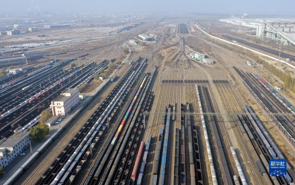 這是包頭西站運(yùn)煤列車編組場(11月2日攝,無人機(jī)照片)。新華社發(fā)(夏亮攝)