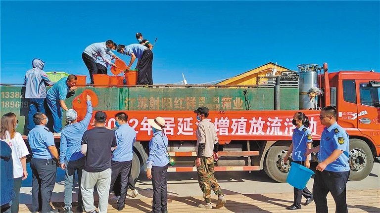 額濟納旗2022年居延海漁業(yè)資源增殖放流活動在風光秀麗、生態(tài)優(yōu)美的居延海畔東歸碼頭啟動,經(jīng)公證機關公證,同意現(xiàn)場向居延海放流草魚魚苗100萬尾,花白鰱89萬尾?;顒蝇F(xiàn)場,前來參與活動的居民拿著水桶,把一條條活蹦亂跳的魚苗放生到居延海中。據(jù)了解,該旗從2008年以來累計放流的魚苗數(shù)量達到了900余萬尾。