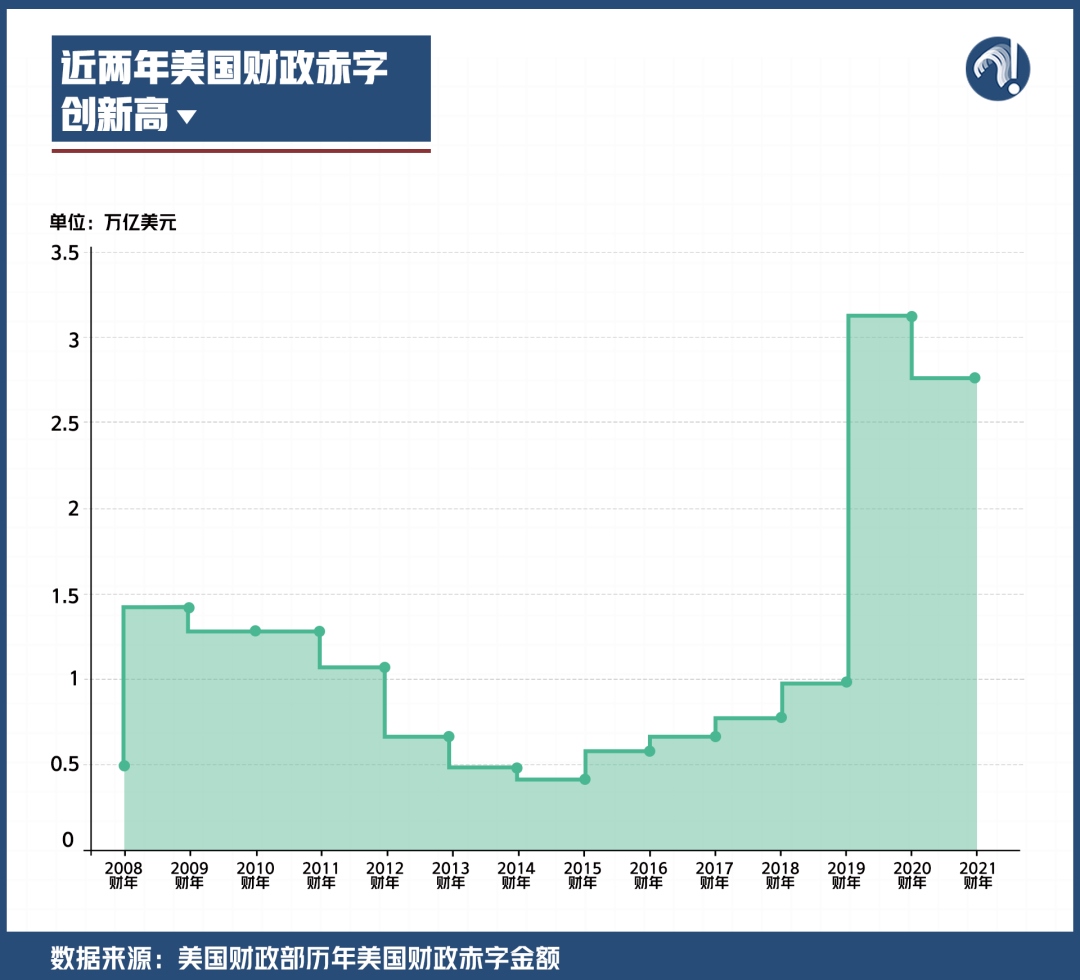 不僅如此,美國還多次出臺大規(guī)模經濟紓困法案,2021年財政赤字率達到了12.4%,甚至已經高于2009年金融危機期間9.8%的歷史最高水平。