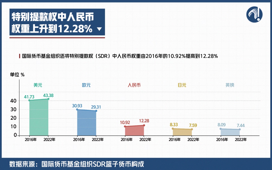 近日,國際貨幣基金組織還將特別提款權(SDR)中人民幣權重由2016年的10.92%提高到12.28%。