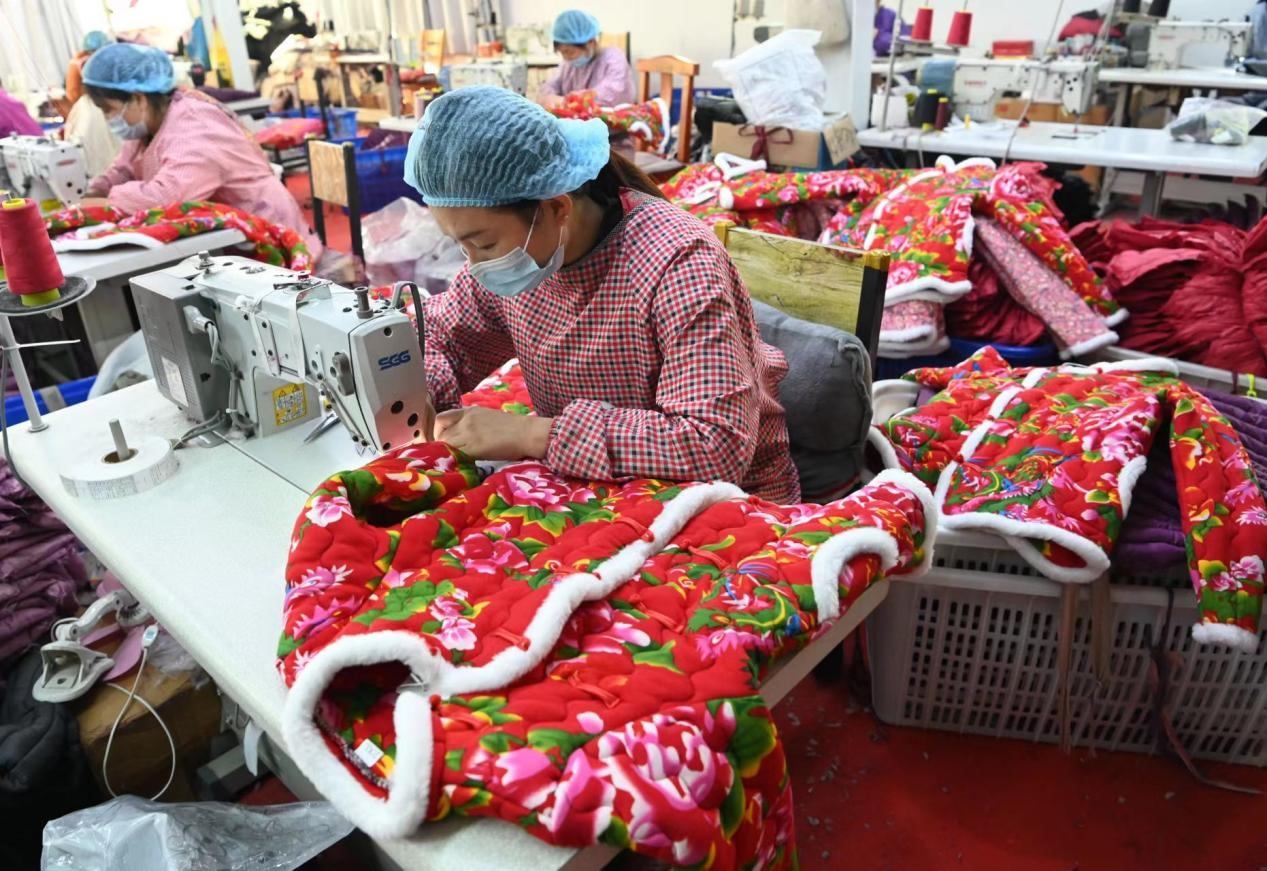 “把制作棉襖的傳統(tǒng)工藝重新挖掘出來,在款式和版型上加入現(xiàn)代的新元素,逐漸得到了市場的認(rèn)可和消費者的喜愛。這些工人有些是脫貧戶、低保戶,通過我們這個平臺她們能得到一部分收入,我們希望吸納更多的家庭婦女加入到我們的隊伍中?!背匡w翔服飾加工廠負(fù)責(zé)人說。
