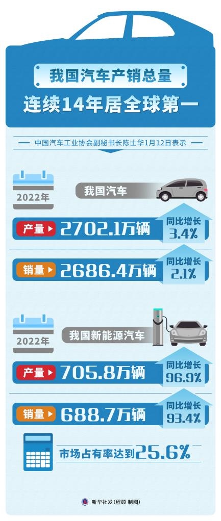 中國汽車工業(yè)協(xié)會(huì)副秘書長陳士華在12日舉行的中國汽車工業(yè)協(xié)會(huì)月度信息發(fā)布會(huì)上表示,2022年,我國汽車產(chǎn)銷分別完成2702.1萬輛和2686.4萬輛,同比增長3.4%和2.1%,全年實(shí)現(xiàn)小幅增長。我國汽車產(chǎn)銷總量已連續(xù)14年居全球第一。