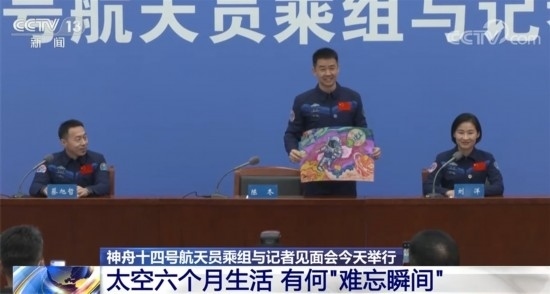 記者會上,航天員陳冬收到了來自家鄉(xiāng)特殊教育學校孩子的一幅畫作。