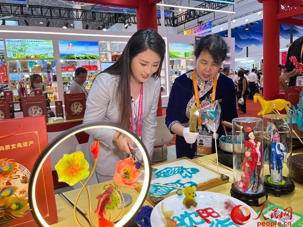 “我們的糖人制作技藝興于清朝道光年間,技法分為吹、塑、畫。結(jié)合消費(fèi)新需求,我們推出了一些新產(chǎn)品,很受年輕人喜歡。在消博會上,通過展示糖人技藝,讓更多的消費(fèi)者了解傳統(tǒng)文化,喜歡上我們的作品?!鄙蜿柪钍咸侨酥谱骷妓嚨谖宕鷤鞒腥死铠P艷表示。