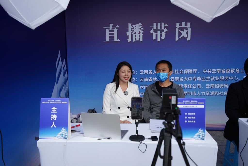 2023年3月3日,在云南省2023年春風(fēng)行動暨就業(yè)援助月專場招聘活動現(xiàn)場,工作人員“直播帶崗”。新華社記者 佟璐 攝