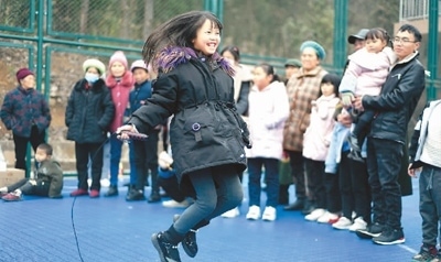 貴州省黔西南布依族苗族自治州安龍縣易地扶貧搬遷安置點(diǎn)春潭街道蘑菇小鎮(zhèn)新市民居住區(qū)舉辦趣味體育運(yùn)動(dòng)會(huì),轄區(qū)居民進(jìn)行了跳繩、拔河比賽等趣味項(xiàng)目,體驗(yàn)運(yùn)動(dòng)的快樂(lè)。圖為小朋友正在參加跳繩比賽。劉朝富攝(人民視覺(jué))