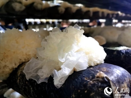 在福建省寧德市古田縣大橋鎮(zhèn)的一處標(biāo)準(zhǔn)化銀耳菇房,一個(gè)個(gè)整齊排列的架子上,培養(yǎng)基中長(zhǎng)出一朵朵晶瑩的“白花”。由于銀耳需要避光、溫暖的生長(zhǎng)環(huán)境,溫控智能化設(shè)備通過霧化、控溫等多項(xiàng)功能,模擬出銀耳在野生環(huán)境的生長(zhǎng)條件。