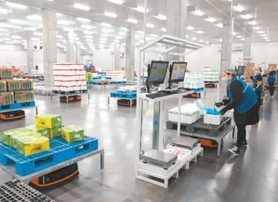 2月27日,在湖北省襄陽市好鄰居生鮮物流中心,機(jī)器人根據(jù)工作人員指令穿梭于貨架之間,自動(dòng)分揀蔬菜、水果等生鮮產(chǎn)品。楊 東攝(人民視覺)