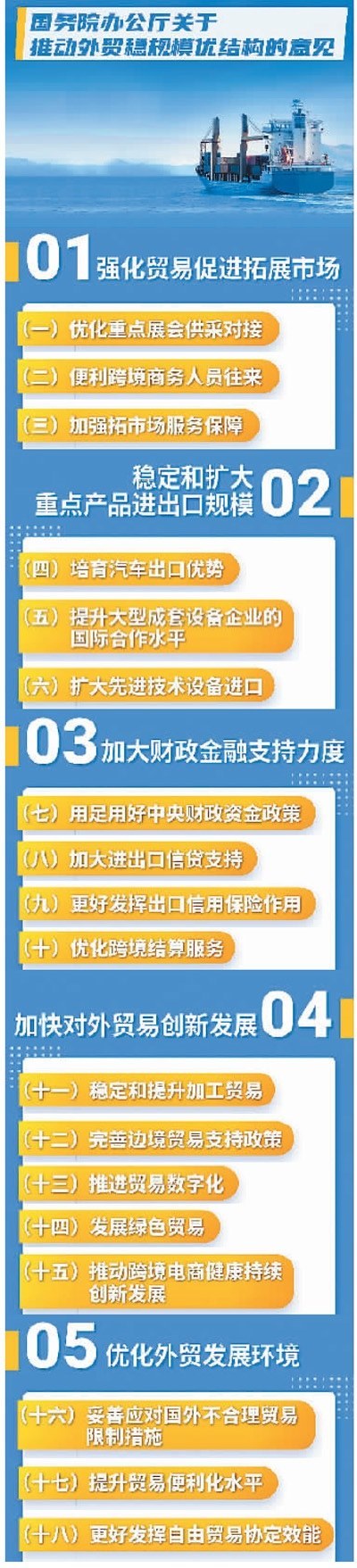 為推動外貿(mào)穩(wěn)規(guī)模優(yōu)結(jié)構(gòu),在前期已出臺多輪政策舉措的基礎(chǔ)上,國務(wù)院辦公廳4月25日對外發(fā)布《關(guān)于推動外貿(mào)穩(wěn)規(guī)模優(yōu)結(jié)構(gòu)的意見》(以下簡稱《意見》),推出新一輪措施。專家認為,此次提出的18條具體措施既涉及重點產(chǎn)品,也關(guān)乎市場拓展和貿(mào)易創(chuàng)新,具有很強的針對性和操作性,有助于穩(wěn)住外貿(mào)規(guī)模,并在此基礎(chǔ)上進一步優(yōu)化外貿(mào)結(jié)構(gòu),推動實現(xiàn)全年進出口促穩(wěn)提質(zhì)目標(biāo)任務(wù)。