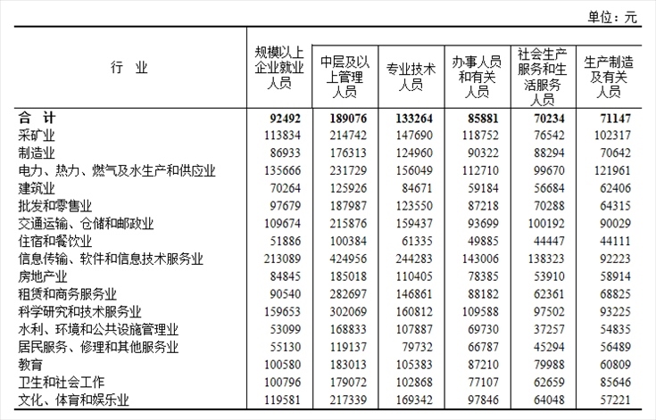 2022年全國規(guī)模以上企業(yè)就業(yè)人員年平均工資為92492元,比上年名義增長5.0%。其中,中層及以上管理人員189076元,增長4.7%;專業(yè)技術(shù)人員133264元,增長6.6%;辦事人員和有關(guān)人員85881元,增長4.1%;社會生產(chǎn)服務(wù)和生活服務(wù)人員70234元,增長3.3%;生產(chǎn)制造及有關(guān)人員71147元,增長3.9%。