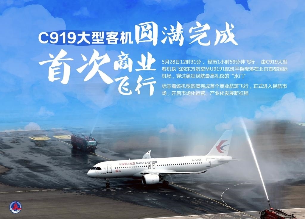 5月28日12時31分,經(jīng)歷1小時59分鐘飛行,由C919大型客機(jī)執(zhí)飛的東方航空MU9191航班平穩(wěn)降落在北京首都國際機(jī)場,穿過象征民航最高禮儀的“水門”,標(biāo)志著該機(jī)型圓滿完成首個商業(yè)航班飛行,正式進(jìn)入民航市場,開啟市場化運(yùn)營、產(chǎn)業(yè)化發(fā)展新征程。新華社發(fā)