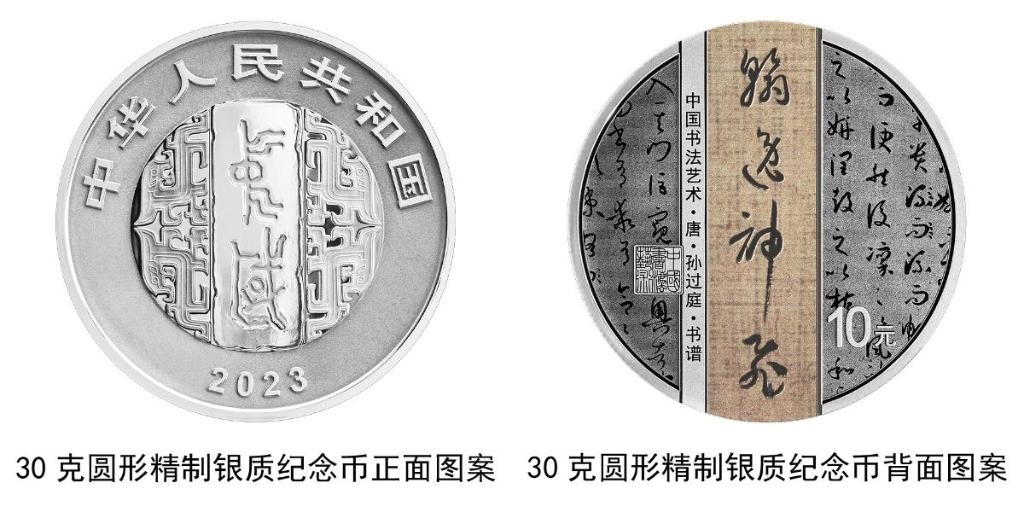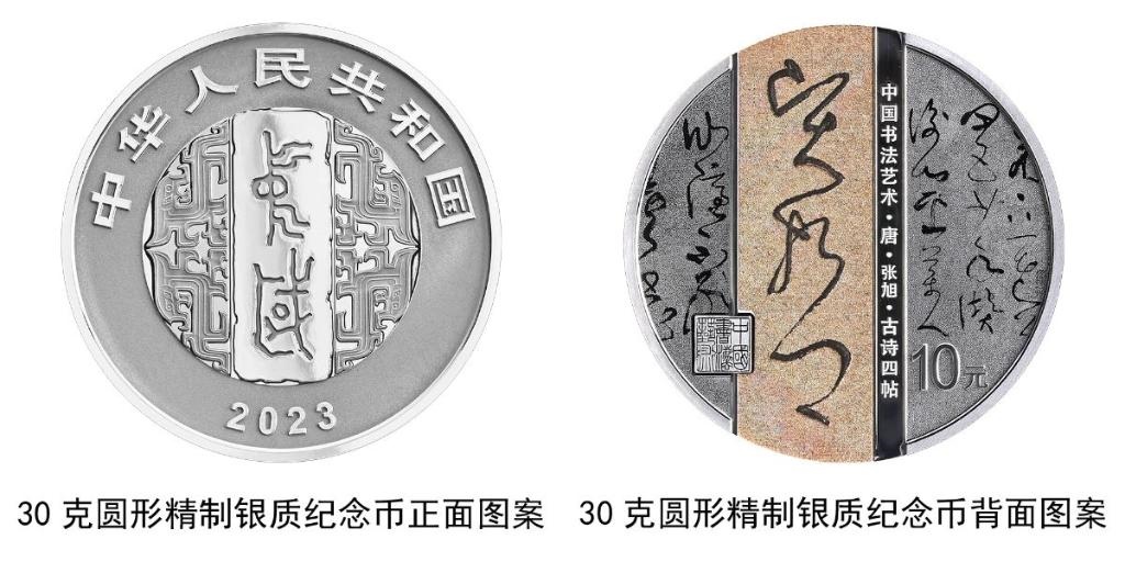 30克圓形銀質(zhì)紀(jì)念幣背面圖案為唐代張旭書《古詩四帖》局部文字及“賢哲”字樣與“中國(guó)書法藝術(shù)”篆刻鈐印等組合設(shè)計(jì),并刊“中國(guó)書法藝術(shù)·唐·張旭·古詩四帖”字樣及面額。