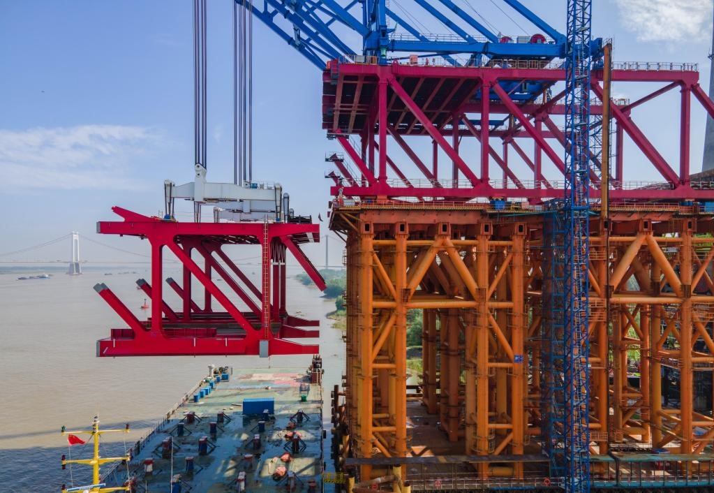 5月28日,馬鞍山長(zhǎng)江公鐵大橋正在進(jìn)行主汊航道橋南側(cè)首節(jié)段鋼桁梁吊裝(無人機(jī)照片)。新華社發(fā)(羅繼勝 攝)