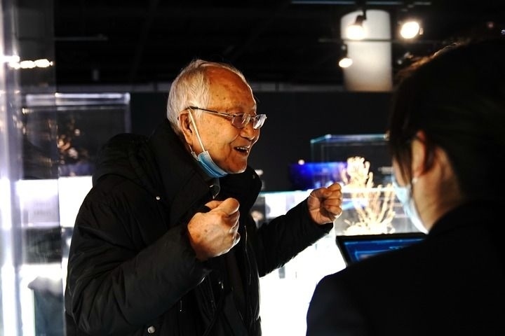 中國(guó)科學(xué)院院士汪品先在上海自然博物館舉行的“深海園林”展上介紹深海知識(shí)(2022年12月3日攝)。新華社記者 張建松 攝