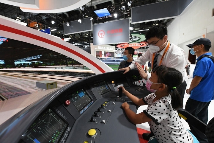 小朋友在2022年中國(guó)國(guó)際服務(wù)貿(mào)易交易會(huì)國(guó)家會(huì)議中心展館體驗(yàn)京張高鐵動(dòng)車組模擬駕駛臺(tái)(2022年9月3日攝)。新華社記者 任超 攝