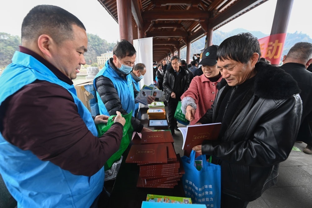 在杭州市臨安區(qū)昌化鎮(zhèn)舉行的春季文化科技衛(wèi)生“三下鄉(xiāng)”服務(wù)活動(dòng)上,臨安區(qū)科學(xué)技術(shù)協(xié)會(huì)“三服務(wù)”小分隊(duì)的黨員志愿者將科普書籍贈(zèng)送給當(dāng)?shù)厝罕姡?023年2月22日攝)。新華社記者 徐昱 攝