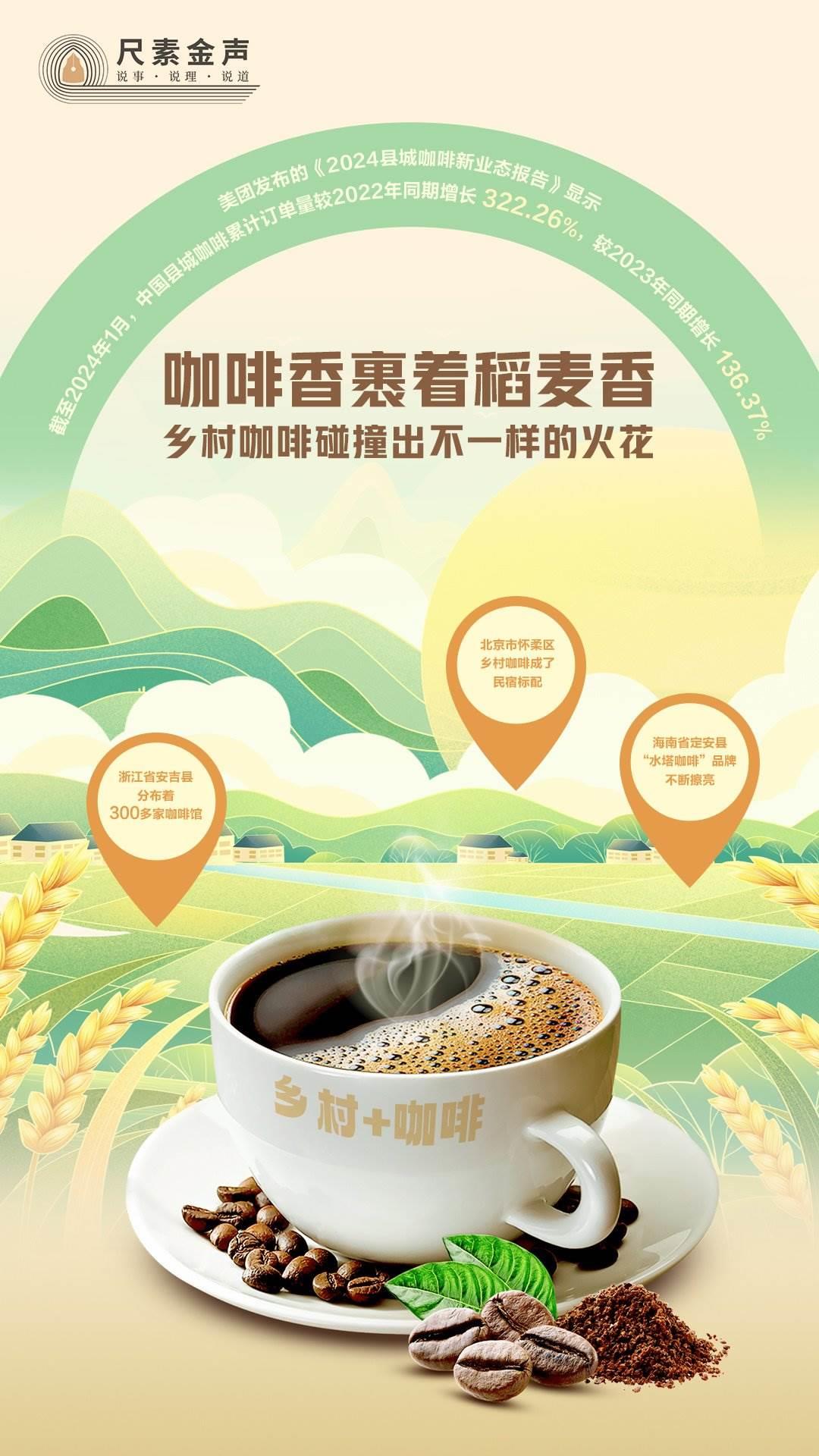 咖啡香裹著稻麥香,吹遍田野。“咖啡+”成為鄉(xiāng)村旅游新業(yè)態(tài)。美團(tuán)發(fā)布的《2024縣城咖啡新業(yè)態(tài)報告》顯示,截至2024年1月,中國縣城咖啡累計(jì)訂單量較2022年同期增長322.26%,較2023年同期增長136.37%。鄉(xiāng)村咖啡火出圈,背后靠什么?
