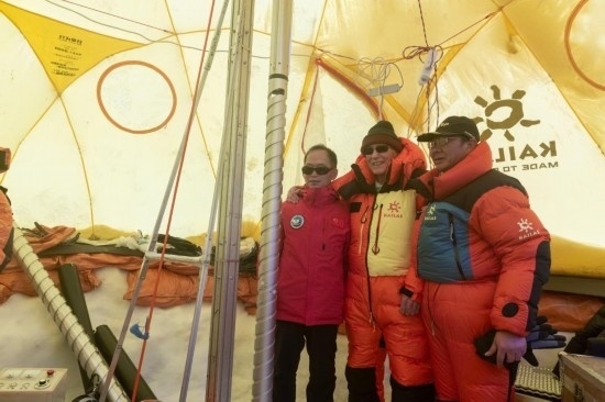 姚檀棟、湯普森在海拔5400米的普若崗日冰原科考主營(yíng)地與部分科考隊(duì)員合影。新華社記者劉詩平 攝