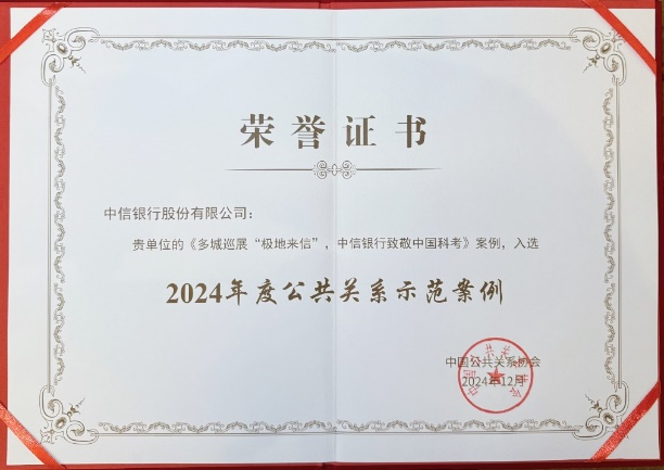 日前,2024年中國公共關(guān)系發(fā)展大會在北京舉辦,中信銀行“極地來信”整合品牌活動通過多輪遴選,成功入選中國公共關(guān)系協(xié)會“2024年度公共關(guān)系示范案例”。