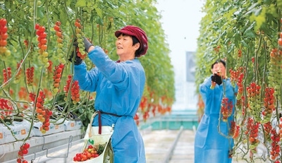 近年來,江蘇省南通市通州區(qū)大力推動智慧設(shè)施農(nóng)業(yè)、生態(tài)高效農(nóng)業(yè)園區(qū)發(fā)展,促進農(nóng)業(yè)生產(chǎn)提質(zhì)增效。圖為通州區(qū)十總鎮(zhèn)圓宏萬嘉智慧農(nóng)業(yè)基地的智能大棚內(nèi),工人在采摘成熟的小番茄。