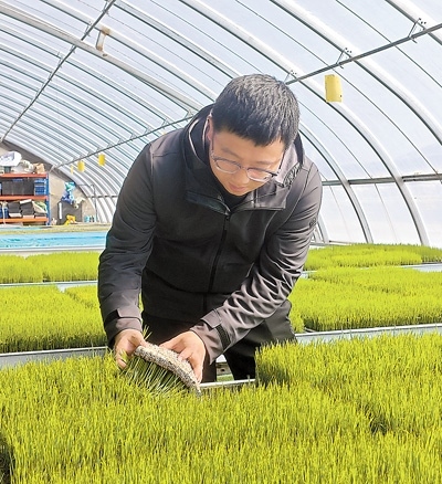 晨曦初照,吉林省農(nóng)業(yè)科學(xué)院水稻研究所副研究員馬巍來到實(shí)驗(yàn)大棚,掀開一塊水稻育苗盤,秧苗青翠茂密,根系密實(shí)盤繞。