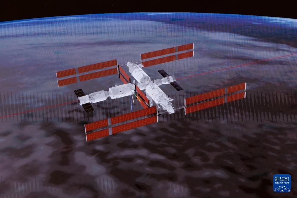 4月24日在北京航天飛行控制中心拍攝的神舟二十號(hào)載人飛船成功對(duì)接空間站天和核心艙的模擬畫面。新華社記者 金立旺 攝