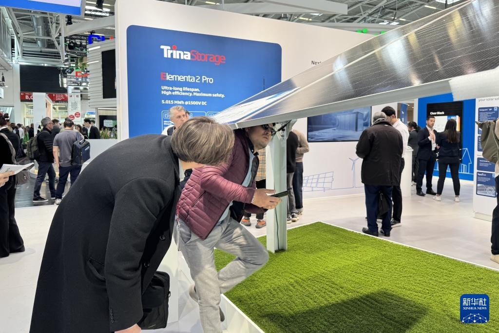 5月7日,參觀者在德國(guó)慕尼黑舉行的2025年歐洲國(guó)際太陽(yáng)能展上參觀天合光能展區(qū)(手機(jī)照片)。新華社記者 黃燕 攝