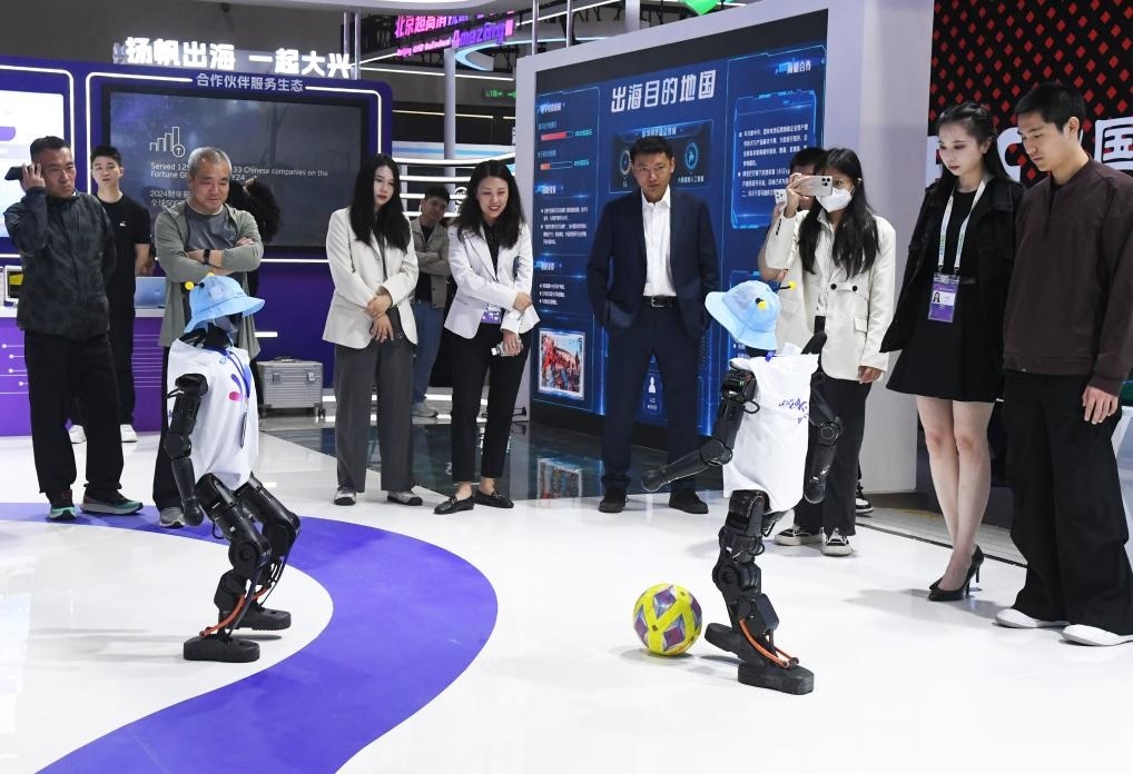 5月8日,機(jī)器人在第二十七屆中國(guó)北京國(guó)際科技產(chǎn)業(yè)博覽會(huì)大興展臺(tái)展示踢足球。新華社記者 任超 攝