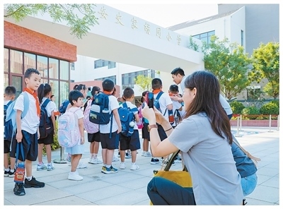 雄安史家胡同小學(xué)校門口,家長(zhǎng)在送孩子上學(xué)。