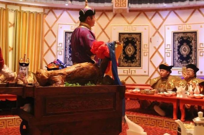 全羊宴是呼倫貝爾地區(qū)款待貴賓和祭奠及盛大節(jié)日宴會上的名貴佳肴,全羊宴色、香、味、形俱佳,別有風味。全羊宴一般選用二歲左右肥全羯羊,其食用儀式頗為隆重,廚師先將整只羊放入大木盤中,在羊脖子上系上紅綢帶,呈給賓客觀看。有些宴席進行開羊儀式,還會伴有呼麥表演。