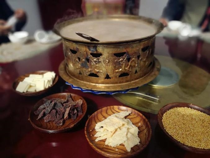 傳統(tǒng)鍋茶的制作方法是先用銅鍋將奶茶熬好,之后加入風干肉、奶酪、奶皮子等,在鍋中邊煮邊吃。吃的時候?qū)⒛滩枋⒃谕胫?,加上奶豆腐和炒米,再和黃油混在一起。越往后,炒米和奶豆腐泡得越軟,味道口感越好。鍋茶咸咸的口味中含有濃濃的奶香,讓人回味無窮。