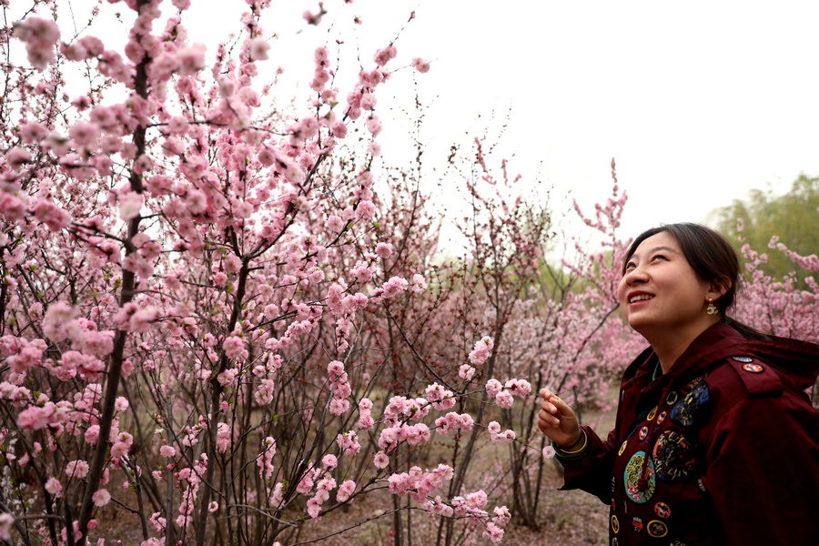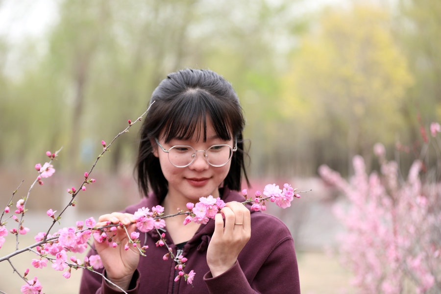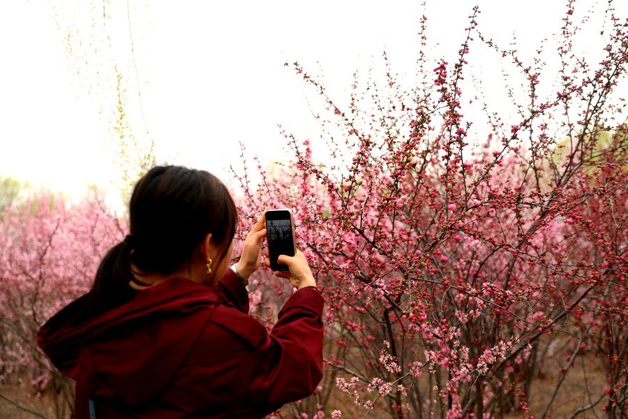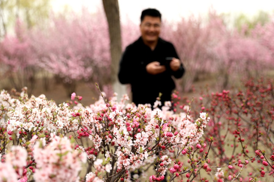 4月27日,呼和浩特南湖濕地公園的榆葉梅盛開(kāi),游客紛紛來(lái)此拍照打卡。