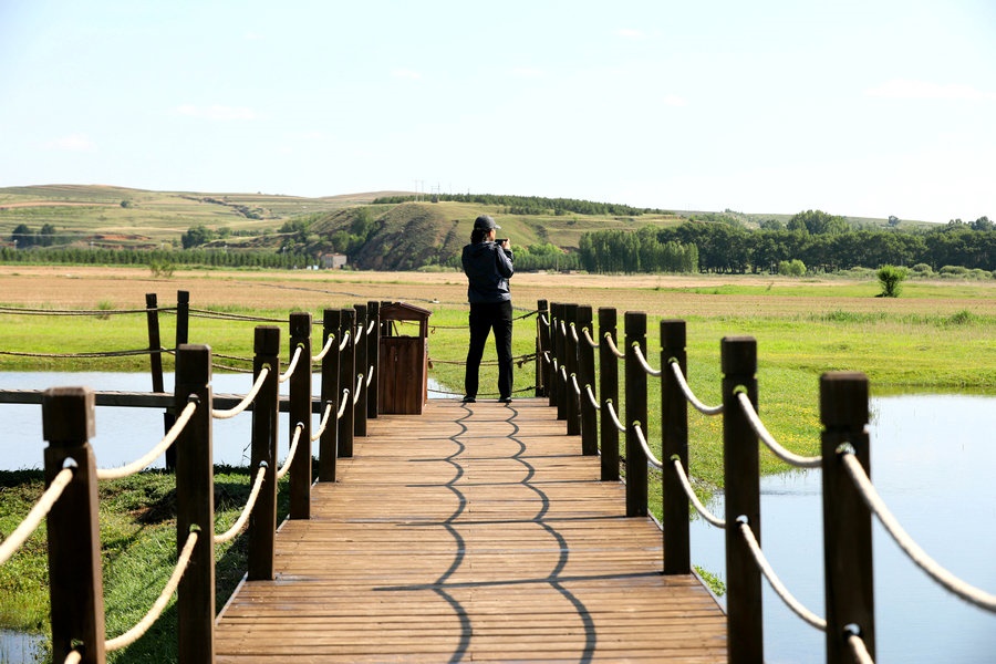 游客在石人灣濕地拍照打卡